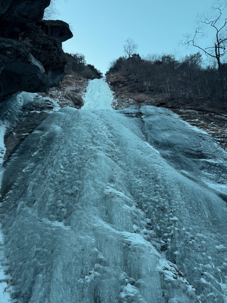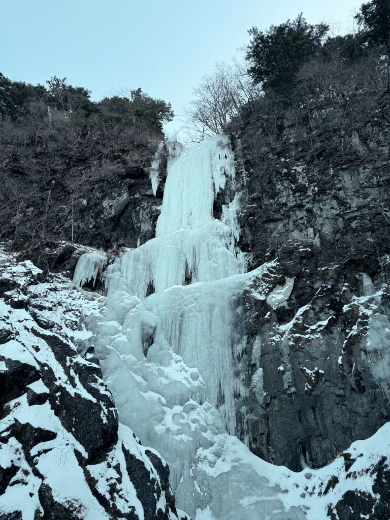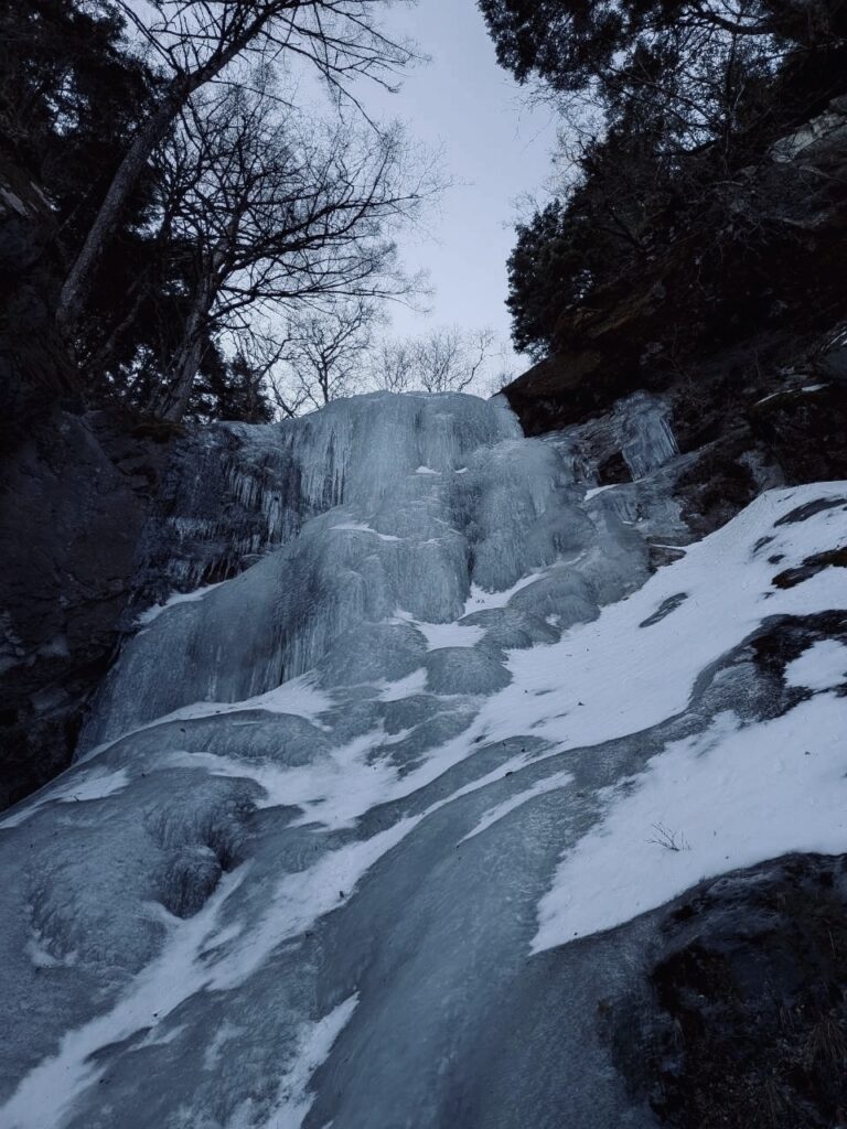 中滝は真ん中〜右側が滴っていて、とてもスクリューが入る感じではなかったので、なるべく左のラインをとりついた。硬いところを選んで登ると、フォローの山本に、「すごい強点をつくなぁ」と不満を言われる。バーティカル部分を残してバトンタッチ。