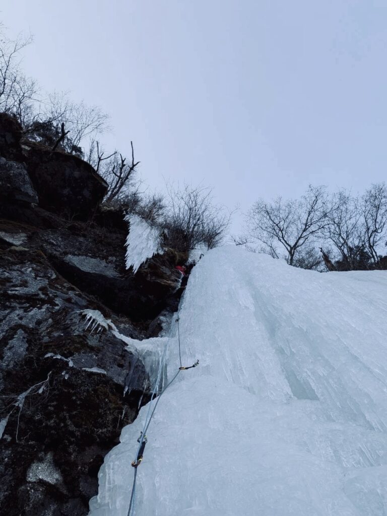 山本がバーティカル部分を登るも、かなり左のラインを登り、岩と氷のチムニーを使いつつ登った。木が邪魔でアックスが振りづらいが面白いライン。弱点主義の境地。登り終えると、なんとまだ滝が潜んでいた。トポには載っていないはずだ。記録は探していない。誰か登っているか?