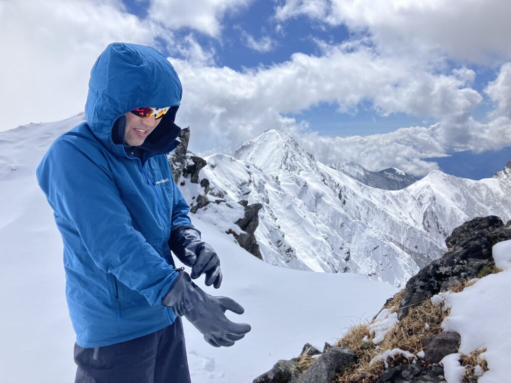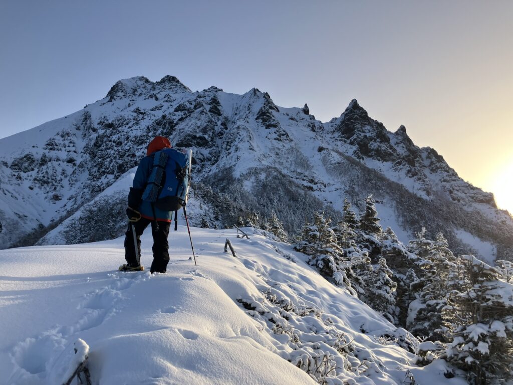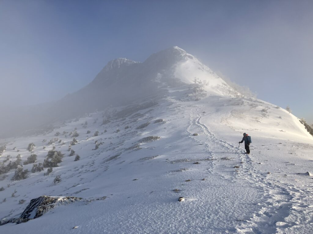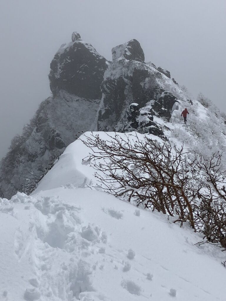 翌日も踏み跡のない中、新雪が乗った赤岳への登りはなかなか悪く、雪崩そうなルンゼでは4点支持での登りになった。