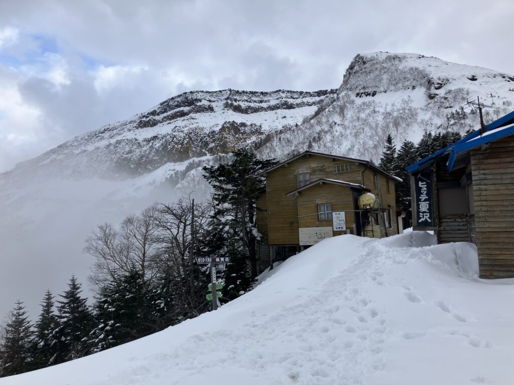 権現岳からの下りの長いハシゴは下部1/3くらいが埋まっていて、いかにも雪崩そうだなぁと思っていたら、案の定2人で数メートル流された・・